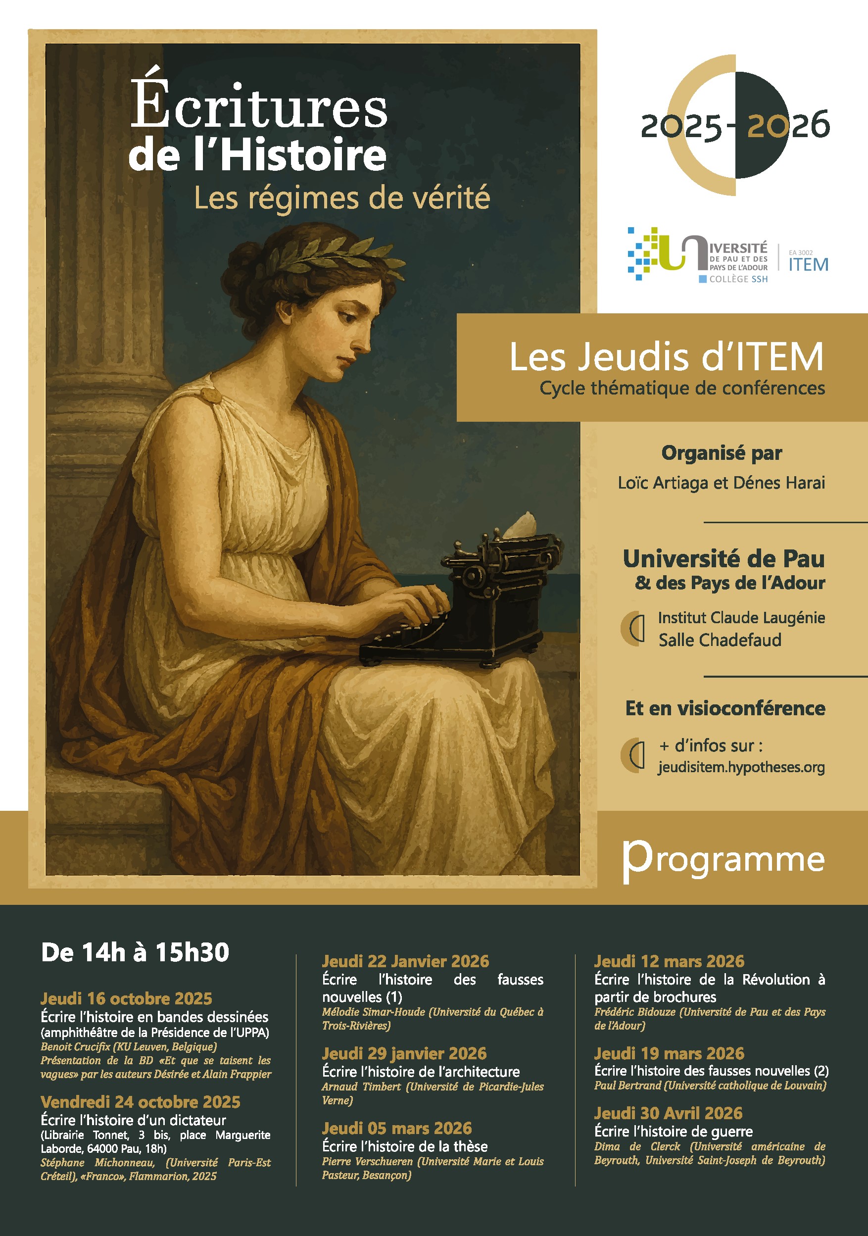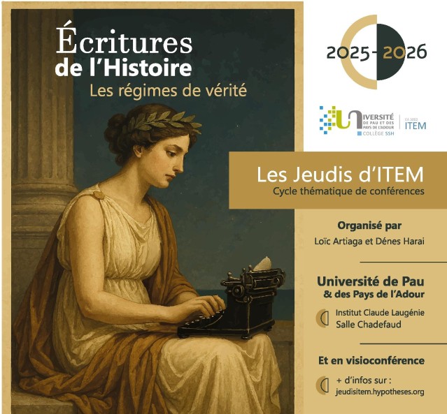 Cette année, les Jeudis d'ITEM innovent et se déclinent sous plusieurs formes. En parallèle des rencontres scientifiques mensuelles habituellement proposées, s'ajoute un cycle thématique intitulé "Les Écritures de l'Histoire : les régimes de vérité" (organisation : Loïc Artiaga et Dénes Harai).