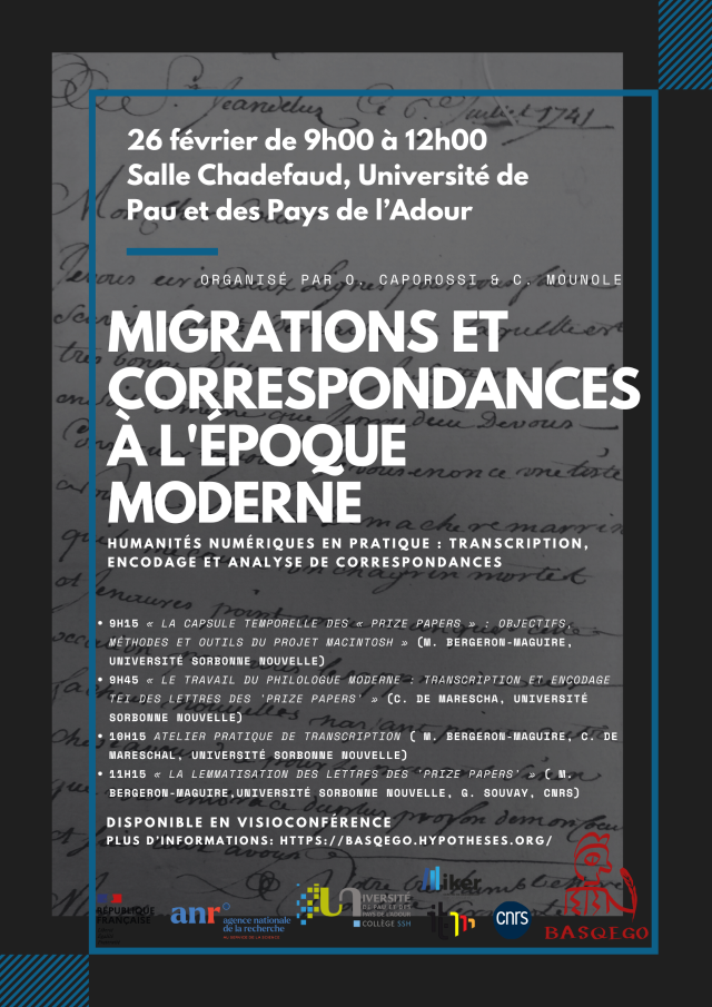 Dans le cadre du master HCP et du projet ANR Basqego, Olivier Caporossi (ITEM) et Cécile Mounole (IKER) organisent un séminaire intitulé "Migrations et correspondances à l'époque moderne. Humanité numériques en pratique : transcription, encodage et analyse de correspondances", le 26 février à partir de 9h en salle Chadefaud de l'Institut Claude Laugénie de l'UPPA.