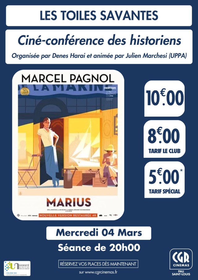 Dans le cadre des Toiles savantes, Julien Marchesi, historien contemporanéiste à l'Université de Pau et des Pays de l'Adour, propose d'animer une conférence en marge de la projection du film "Marius".